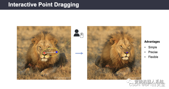 这种方式具有以下几个优点:首先,它非常简单易用,只需要两个点的坐标信息;其次,用户可以精确指定抓取点和目标点的位置和距离,从而实现高度精确的编辑和调整;最后,它非常灵活,可以应用于各种不同的图像编辑场景,例如改变图像的大小、姿态、位置等。