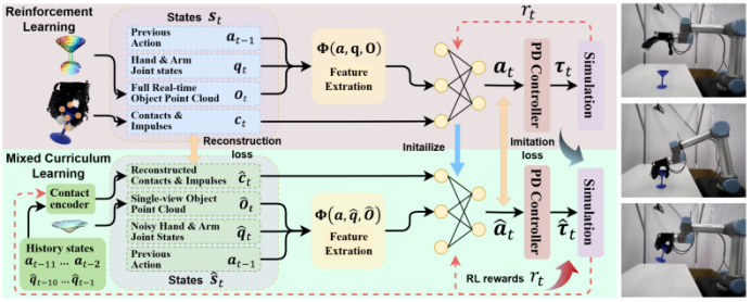 在机器人抓取领域,传统方法常受限于对已知物体的依赖、静态抓取姿态的局限性,以及对外部干扰(如碰撞、观测噪声)的低适应性。苏黎世联邦理工学院联合香港科技大学以优傲机器人(UR5机械臂)搭载灵巧手为硬件载体,提出了一套基于强化学习的动态灵巧抓取框架,旨在解决 “未知物体泛化抓取” 和 “干扰下稳健抓取” 两大核心问题。