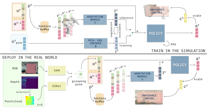 图2:在模拟中,研究人员训练一个特权观测编码器来生成潜在表示z,并同时训练一个自适应模块0,以便从H=10个先前的(o',d'1)对中推断出这个表示z。然后,将潜在表示z与期望的抓取姿态p'机器人本体感受g、机器人-物体距离8'和分类物体参数连接起来,形成策略输入。在现实世界中,研究人员以端到端的方式使用自适应模块o展开训练好的策略,执行到达、抓取和操作。研究人员利用在第一帧捕获的一幅RGBD图像,通过现成的视觉模块提取期望的抓取姿态p。