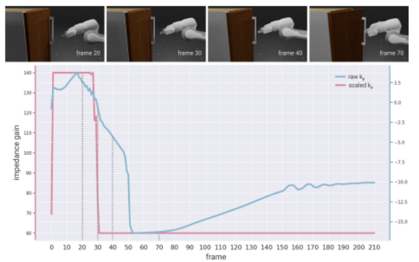 图3.研究人员学习到的控制器增益即使在没有直接增益奖励的情况下也能主动适应操作阶段:在到达时更硬,在打开时更软。