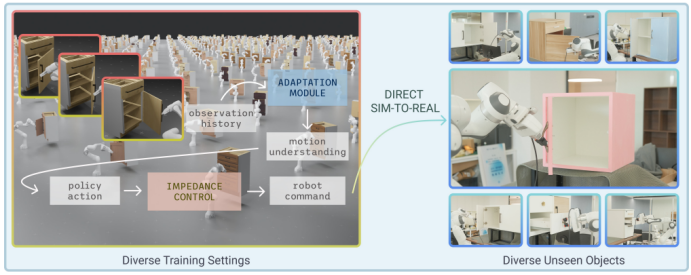 图 1:研究人员训练了一个强化学习策略,用于在模拟环境中打开门和抽屉,该策略会根据通过利用历史观测数据(左图)来处理物体。研究人员直接应用这一策略,在现实世界中达到了80%的关节极限 采用闭环可变阻抗控制,仅使用一帧首帧RGBD图像(右图),成功率达到84%。