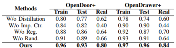 图4:我们在现实世界中对我们的策略进行了广泛评估,使用了各种未见过的物体,这些物体在外观、尺寸上各不相同 铰链方向和铰链刚度。我们在合理的工作空间中展示了我们的性能,物体朝前 或绕z轴稍微倾斜。