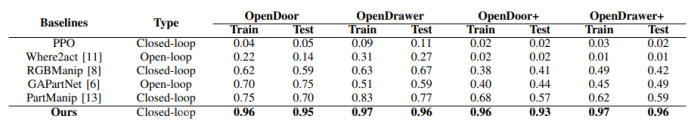 闭环方法:PPO(纯RL无优化)、PartManip(视觉驱动RL,点云输入)、RGBManip(单目视觉闭环,多视角感知)。