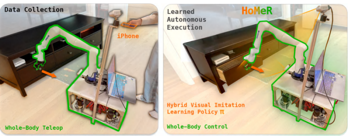 为此,斯坦福大学和剑桥大学研究团队提出HOMER 框架,通过结合基于运动学的全身控制器(处理基座与手臂协调)和混合模仿学习策略(切换长距离绝对姿态与精细操作相对姿态预测),并整合视觉语言模型提升泛化能力。
