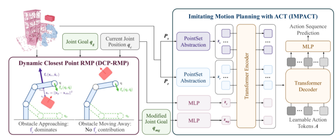 1:深度反应策略 (DRP) 是一种专为动态真实环境设计的视觉运动神经运动策略。首先,局部反应式 DCP-RMP 模块会调整关节目标,以应对局部场景中快速移动的动态障碍物。然后,基于 Transformer 的闭环运动规划策略 IMPACT 将场景点云、修改后的关节目标和当前机器人关节位置作为输入,输出动作序列,供机器人实时执行。