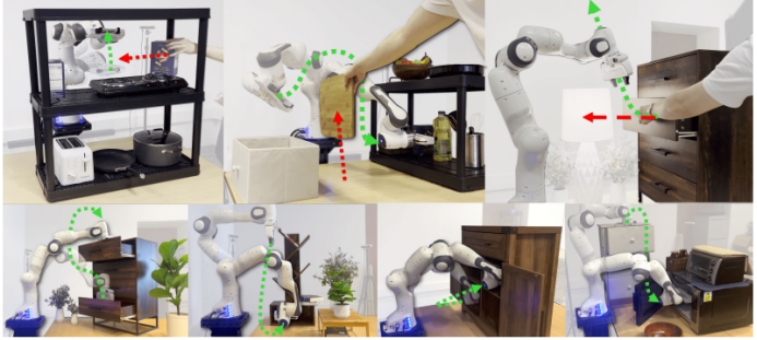 在家庭、厨房等人类日常动态环境中,机械臂需在快速变化、部分可观测的场景下实现无碰撞运动,传统全局规划方法(如A*、RRT)依赖完整环境信息,在动态障碍场景中执行速度慢,难以实时调整轨迹;局部反应式方法(如 RMP、几何结构)虽能应对动态障碍,却缺乏全局场景感知,在杂乱环境中易陷入局部极小值;现有神经运动策略(如 MπNets、NeuralMP)则存在泛化能力弱或依赖测试时优化牺牲实时性的问题。