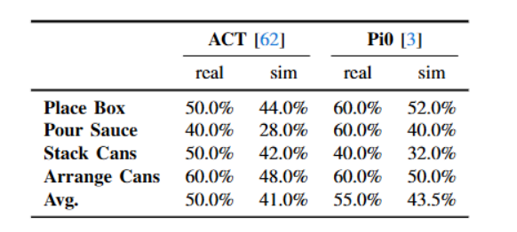 核心支撑:上图(FR3视觉基准测试结果)显示,仿真与真实成功率的相关系数达 0.9 以上,且下图表1中ACT、Pi0两种算法的 “仿真 - 真实差距” 均小于 10%,证明GSWorld可作为可靠的基准测试平台。