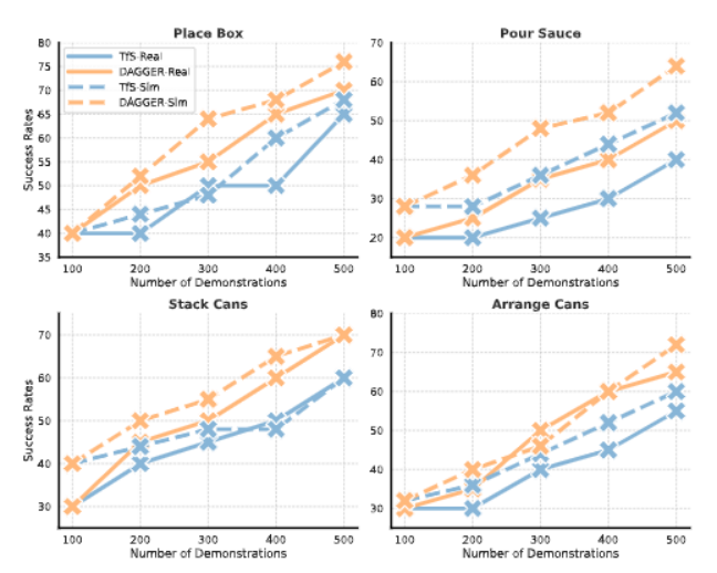 核心支撑:经过5次DAgger 迭代后,FR3 “堆叠罐头” 任务的真实成功率从30%提升至70%,远超 “从头训练” 的60%上限,证明闭环迭代的效率优势。