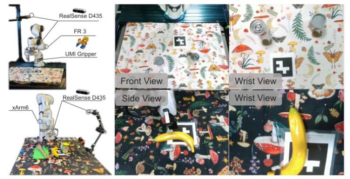 多视角数据采集:同步使用 FR3 的腕部相机、第三人称固定相机与手机相机,采集场景图像并记录机械臂关节姿态;