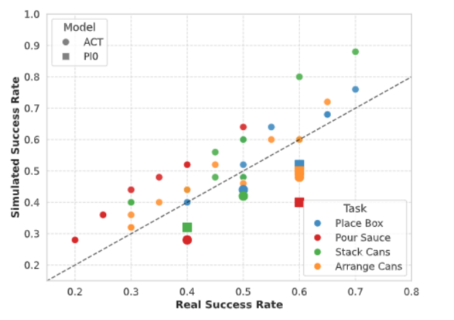 验证方案:在GSWorld中训练不同质量的策略(通过调整数据量、训练迭代次数控制),分别测试 “仿真成功率” 与 “FR3 真实成功率”,计算相关性;