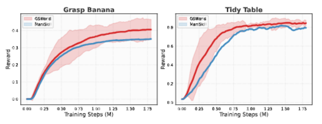 核心支撑:在“抓取香蕉” 任务中,GSWorld训练的策略真实成功率达30%,而 ManiSkill 仅为 0%,证明3DGS 渲染对RL策略迁移的关键作用(下图:RL训练结果对比)。