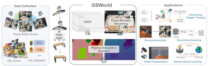 GSWorld 的核心优势在于构建 “现实 - 仿真” 双向对齐的闭环框架,整体流程分为 “现实到仿真的场景重建”与 “仿真到现实的策略迁移”两大模块,具体逻辑如下: