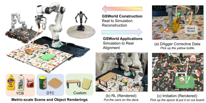 物体资产整合:整合 YCB(通用物体数据集)、DTC(高真实感物体数据集),并支持自定义物体的 3DGS 重建(如香蕉、罐头),通过称重法标注物体质量,补绘未观测区域;