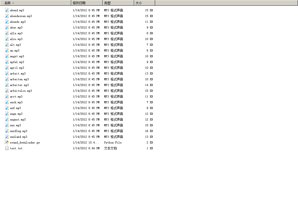 下面两张截图是运行效果图,其中图1是运行效果图。是的,有些单词的mp3下载过程中出错了,这是由于某些单词的发音太简单了,这些单词级别估计是1级,估计是网站的设计者觉得这种简单的单词没有必要制作一个mp3文件放在上面。一般来说,稍难一点的单词的发音都能下载到的。图2是下载后的截图,以后可以用来催眠了。