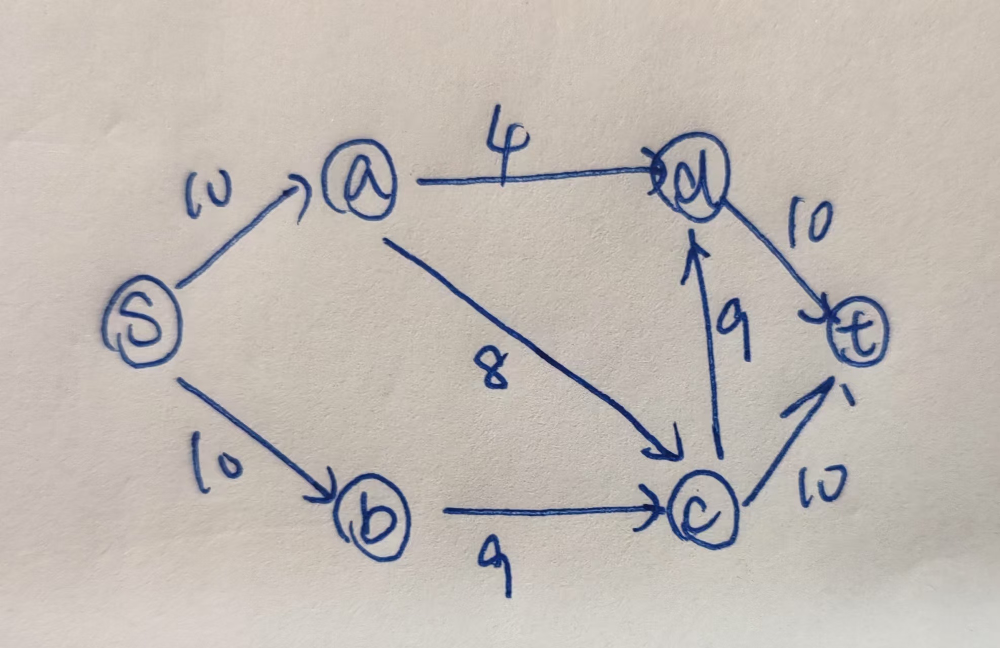 - (20分)题目给出一个流网络图,求最大流量,要求写出每一次选择的增广路径