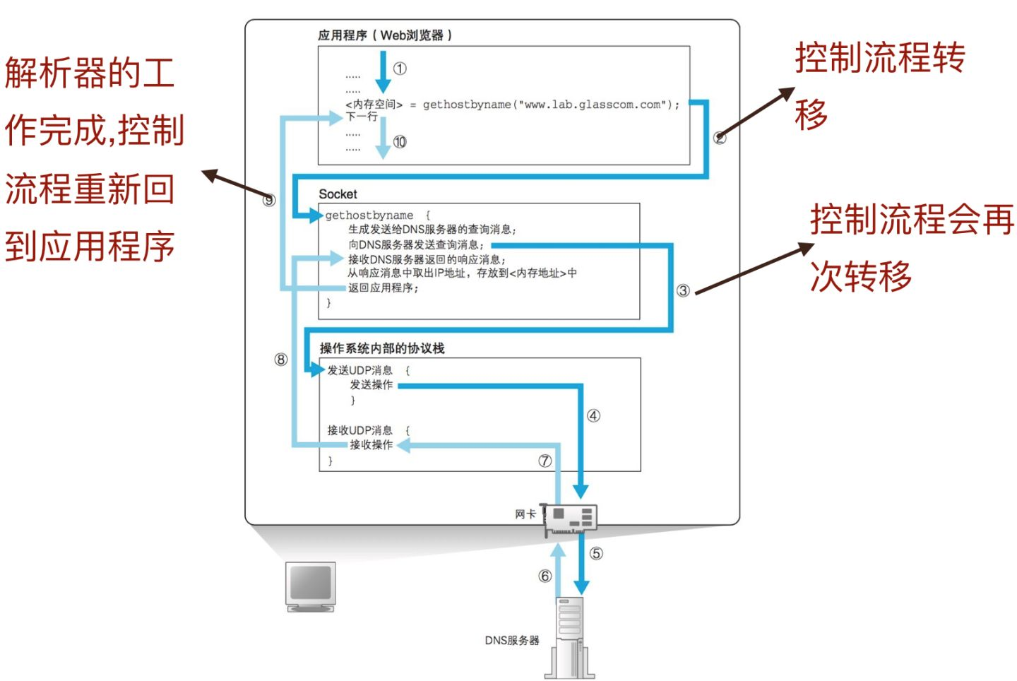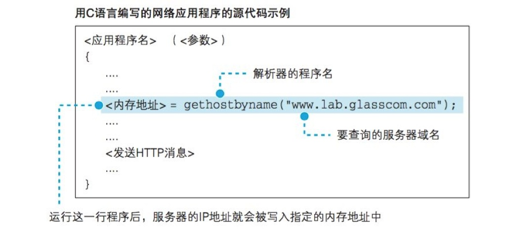 通过 DNS 查询 IP 地址的操作称为域名解析,负责执行解析这一操作的就叫解析器。 解析器实际上是一段程序,它包含在操作系统的 Socket 库中 (Socket 库可以让其他的应用程序调用操作系统的网络功能 )。 解析器的用法非常简单,编写应用程序(这里也就是指浏览器)时,如下图写上解析器的程序名称(gethostbyname)以及web服务的域名(http://www.lab.glasscom.com/)进行调用就可以了,这样就完成了对解析器的调用。