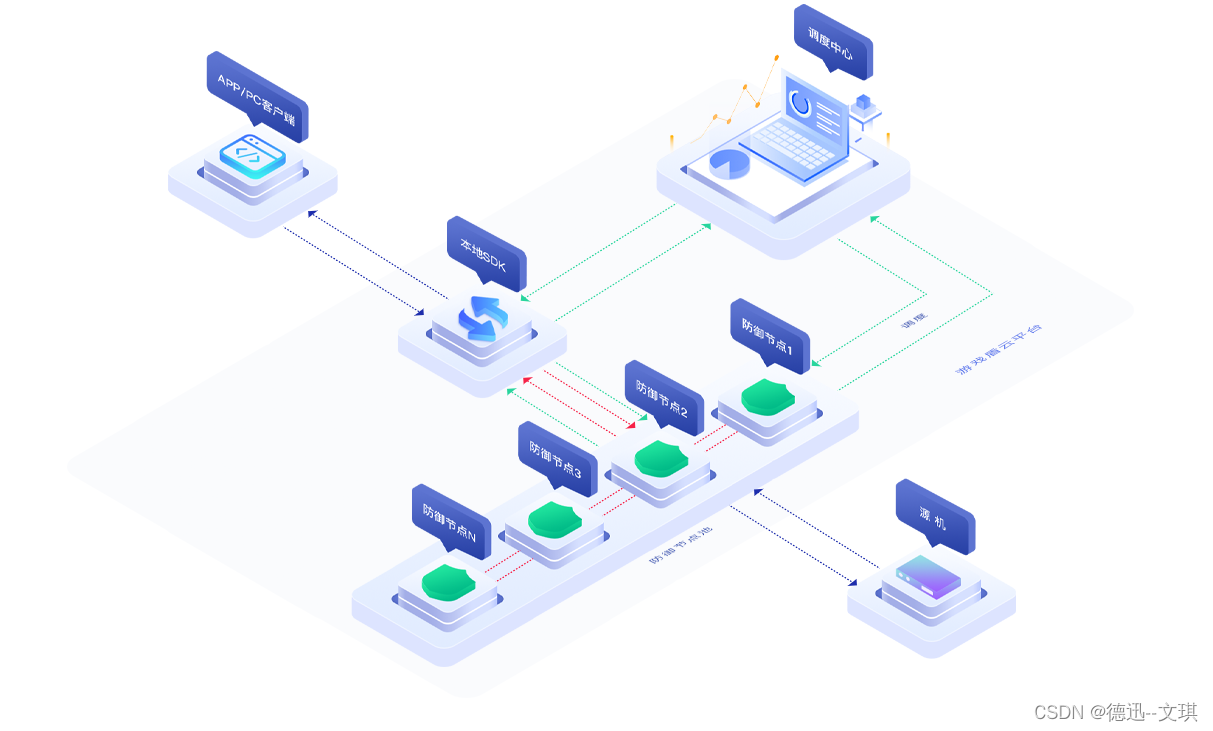 德迅抗D盾是新一代的智能分布式云接入系统,接入节点采用多机房集群部署模式,隐藏真实服务器IP,类似于网站CDN的节点接入,但是“抗D盾”是比CDN应用范围更广的接入方式,适合任何TCP 端类应用包括(游戏、APP、微端、端类内嵌WEB等)。用户连接状态在各机房之间实时同步,节点间切换过程中用户无感知,保持TCP连接不中断,轻松应对任何网络攻击。