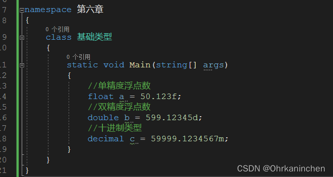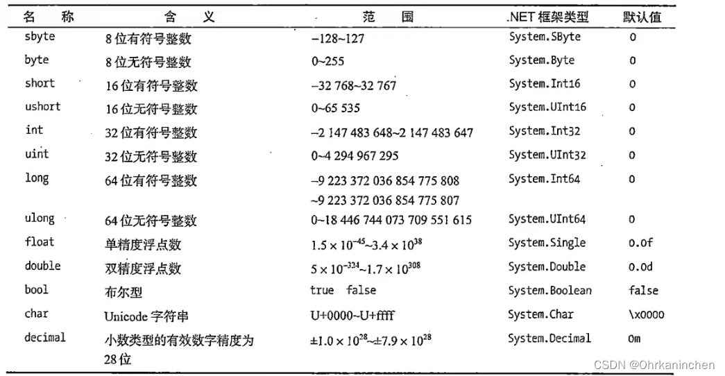 十进制类型(decimal、128位、默认值0.0m),与float和double相比,它具有更高的精度和更小的范围,适用于财务和货币的计算。