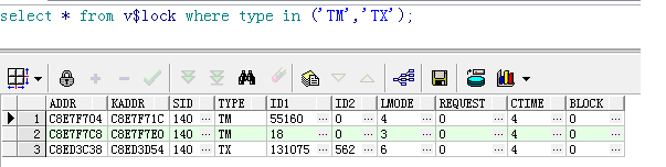 SQL> select * from v$lock where type in ('TM','TX'); ADDR KADDR SID TY ID1 ID2 LMODE REQUEST CTIME BLOCK -------- -------- ---------- -- ---------- ---------- ---------- ---------- ---------- ---------- CA4244F4 CA424508 147 TX 393242 563 0 6 270 0 C8E7F704 C8E7F71C 140 TM 55156 0 3 0 301 0 C8E7F7C8 C8E7F7E0 147 TM 55156 0 3 0 270 0 C8ED3C38 C8ED3D54 140 TX 393242 563 6 0 301 1