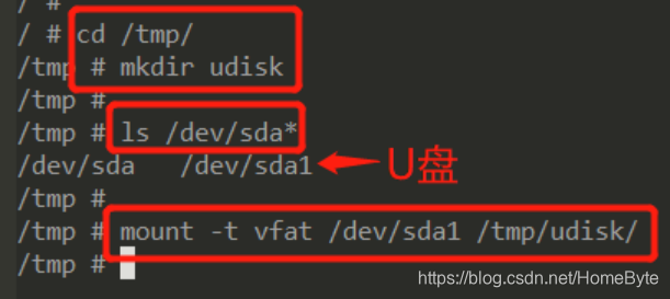 挂载命令:mount -t vfat /dev/sda1 /tmp/udisk/