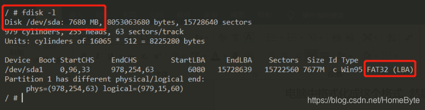 编译完成后,烧录更新内核,准备一个fat32格式的U盘,可以在电脑中格式化成这个格式,然后U盘接入到开发板的USB接口(Host)中,正常情况下可以看到U盘的信息: