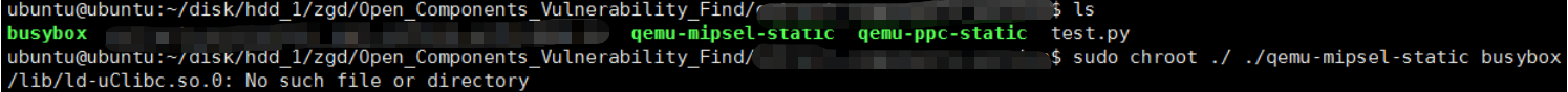 接着我又做了一个很弱智的尝试,将要仿真的那个组件busybox拷贝到其他目录下,将qemu和busybox放在同一目录下,然后再次进行仿真发现依旧是出现/lib/ld-uClibc.so.0: No such file or directory错误。