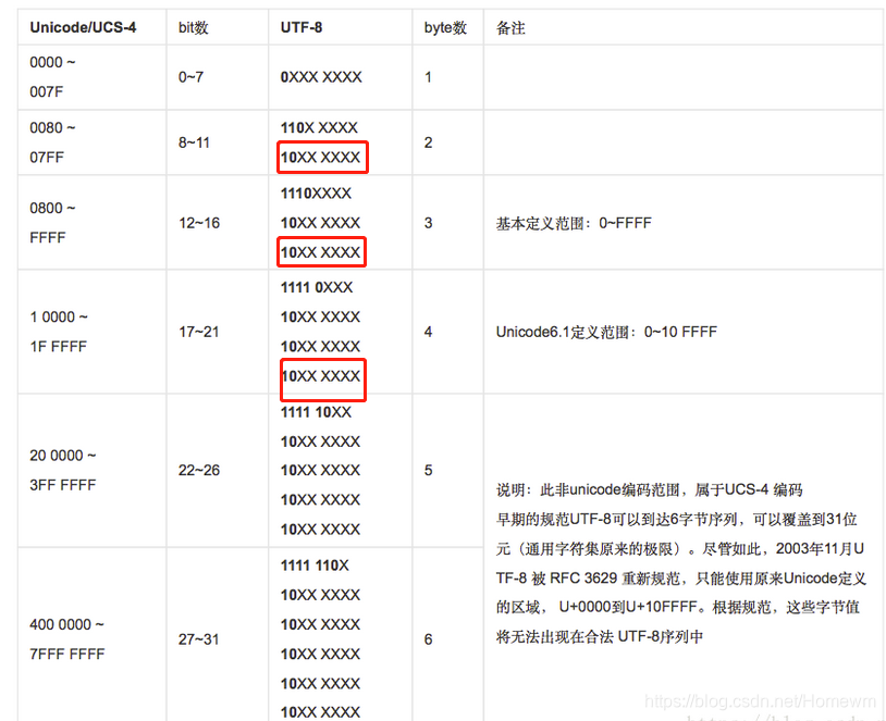 或许很多人会很疑惑为什么下面这句话是0xC0==0x80?直接看下表被圈的红色框中,是为了确保index指向的byte的首位为1