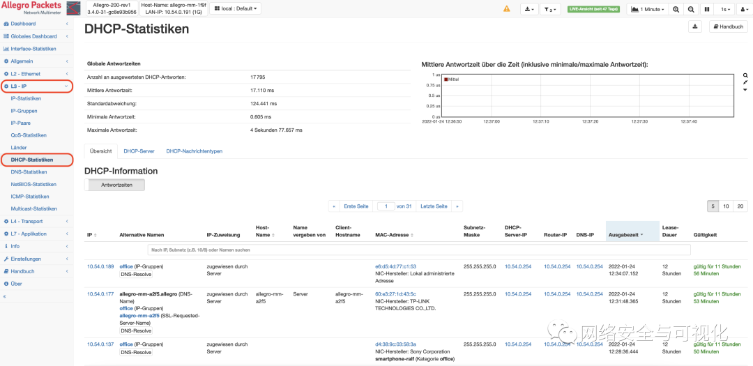 DHCP 服务器将动态 IP 地址分配给设备。如果设备上未启用或不支持 DHCP,则必须手动分配静态 IP 地址。Allegro网络万用表中的 DHCP 统计信息用于查找 DHCP 服务器分配的 IP 地址。例如,在显示的通过DHCP分配的所有IP地址列表中,可以快速轻松地搜索主机名或设备制造商。地址分配的时间段也可以方便地受到限制。