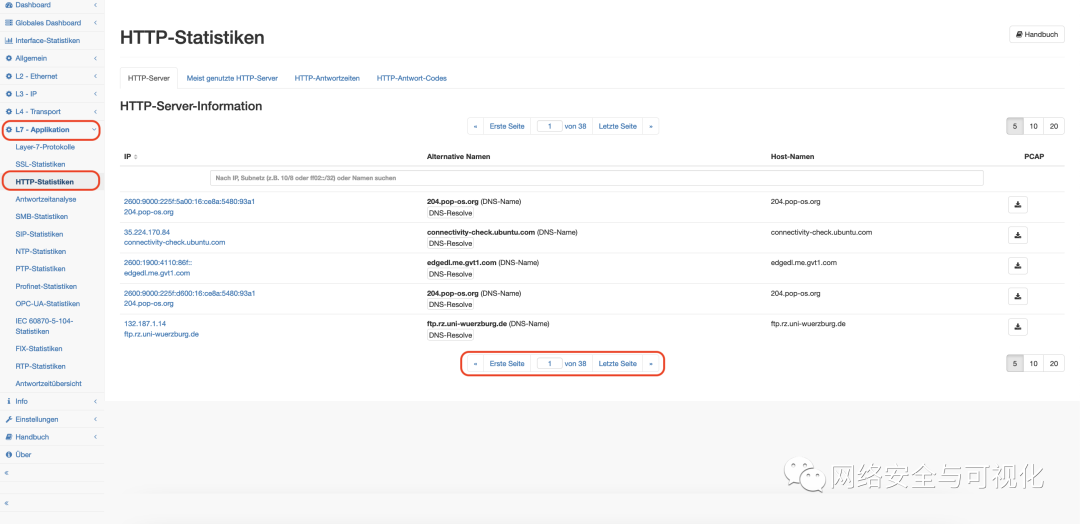 HTTP模块还提供对IP地址的访问。例如,如果要找出移动电话的IP地址,必须在移动电话上打开任何网站(例如allegro-packets.de),并将其导航到HTTP统计。在这里,服务器(网站)被搜索到,网络服务器的IP地址出现。点击IP地址会显示细节。通过这样,可以看到哪些IP地址在什么时间与该服务器进行了联系。也有一些网站直接显示所谓的IP。然而,那里只显示互联网连接的公共IP,而不是终端设备的IP。使用Allegro网络万用表就可以做到这一点。
