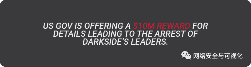 DarkSide以其对隐形的有效利用而闻名。勒索软件是为个别目标量身定做的,配有定制代码和连接主机,使得攻击难以追踪。此外,它会在文件加密之前保持耐心,花时间首先确定环境的范围。这一过程需要劫持特权帐户、获取凭据和其他有价值的数据,以及删除备份。袭击的复杂性和高调的目标促使美国政府悬赏1000万美元寻找逮捕黑暗势力领导人的细节。