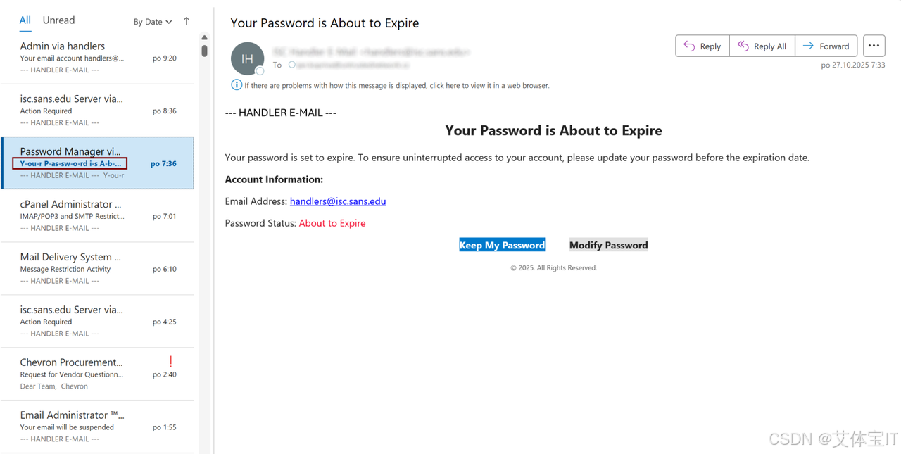 这些邮件的主题原本是“Your Password is About to Expire(你的密码即将过期)”,但攻击者在单词间悄悄插入软连字符,使得过滤系统识别到的内容被分割成碎片化的字符串,从而无法匹配到恶意关键词。而对收件人来说,这些字符在大多数邮件客户端(如 Outlook)中不会显示,看到的仍是一封“正常”的通知邮件。