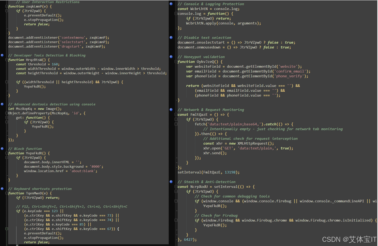 开发者工具检测:网页背后的代码会持续监控浏览器环境,一旦检测到开发者工具被打开(这表明页面可能正在被安全分析师检查),便会终止会话。