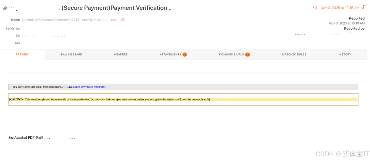 包含混淆有效载荷的钓鱼邮件,该有效载荷封装于PDF附件中,在KnowBe4 PhishER页面中显示。