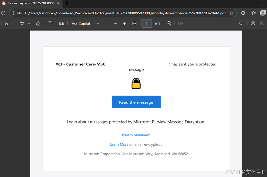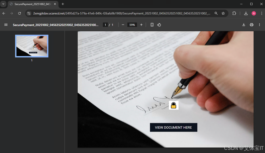 恶意负载——一个钓鱼链接——被隐藏在“嵌套式”PDF附件中。当收件人打开邮件中的初始附件时,会看到一个渲染后的文档,其中包含另一个需要点击的超链接。
