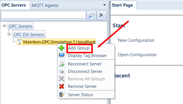 (1)右键点击刚添加的OPC DA Server,选择菜单中中“Add Group”添加OPC组