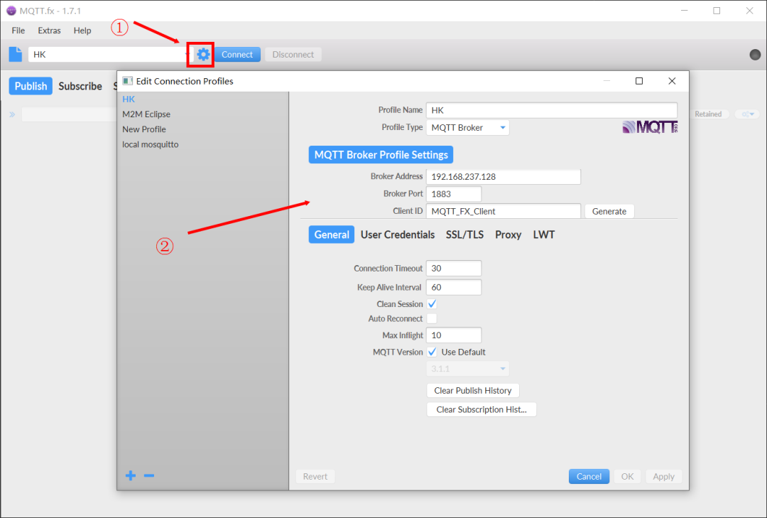1. 打开MQTT.fx软件,配置MQTT Broker连接参数