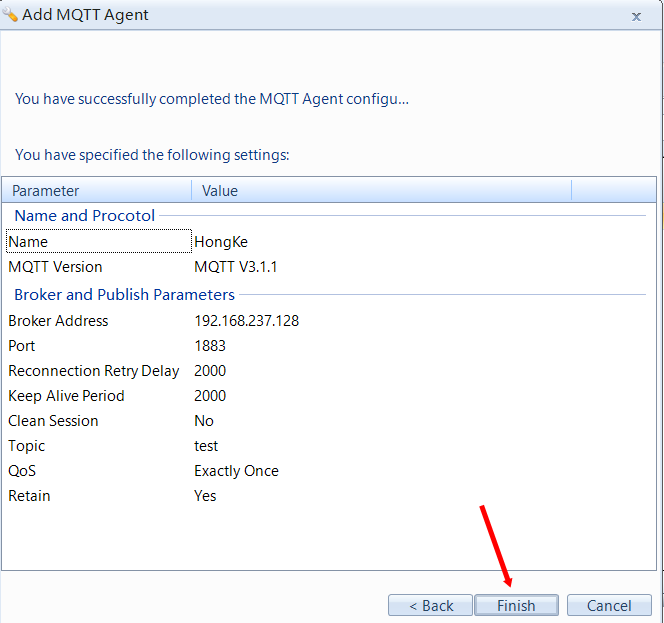 (4)点击“Finish”完成MQTT发布端参数配置