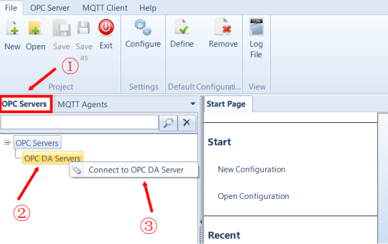 1. 打开虹科OPC Client for MQTT软件,点击菜单栏中“OPC Servers”添加OPC DA Server