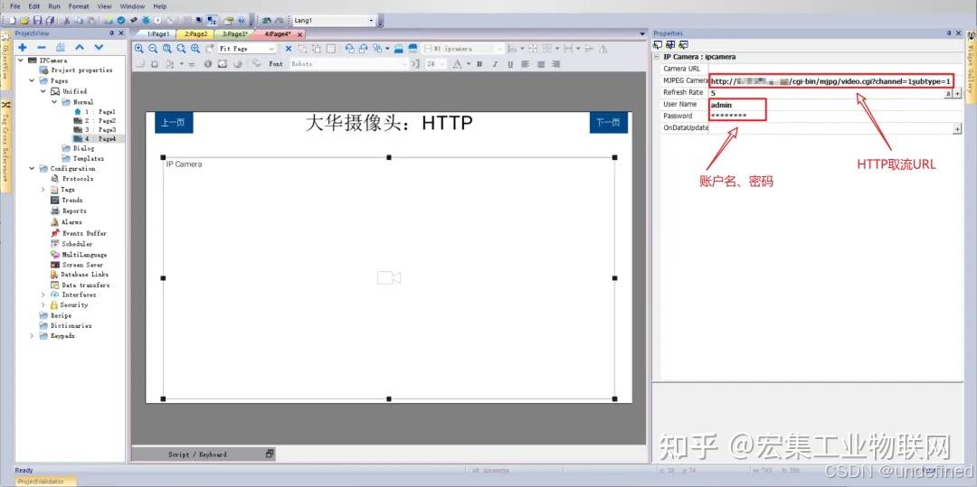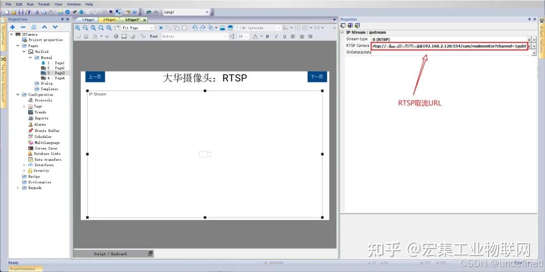 宏集eX700系列HMI内置IP Stream和IP Camera两种摄像头控件,支持通过RTSP、HTTP协议采集并显示海康威视、大华等知名品牌摄像头监控画面。同时,控件操作简单易上手,只需要查询并配置摄像头取流URL地址、账户名、密码即可完成摄像头画面采集。