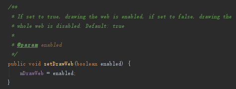 Step 1:既然圆点是在网线各个顶点,那便跟绘制网线相关联,我们可以从绘制网线的公开方法入手去查找,最先想到就是setDrawWeb方法,直接影响网线的绘制,这个方法也很简单只设置了mDrawWeb的值。