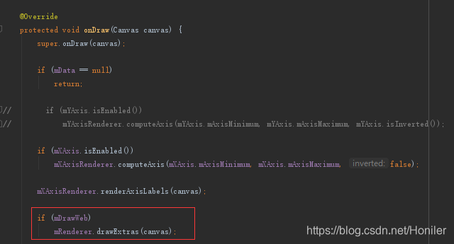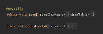Step 2:接下来我们要查找变量mDrawWeb在绘制中的实际已应用,绘制便跟onDraw方法有关。可以看出绘制网线时,调用了mRenderer变量的drawExtras(canvas)。