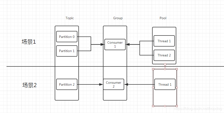 根据消费者和分区关系,在结合多线程具体使用场景有:多线程处理一个消费者只消费一个分区;多线程处理一个消费者消费多个分区。对应模型图为: