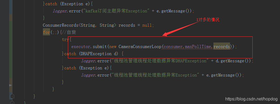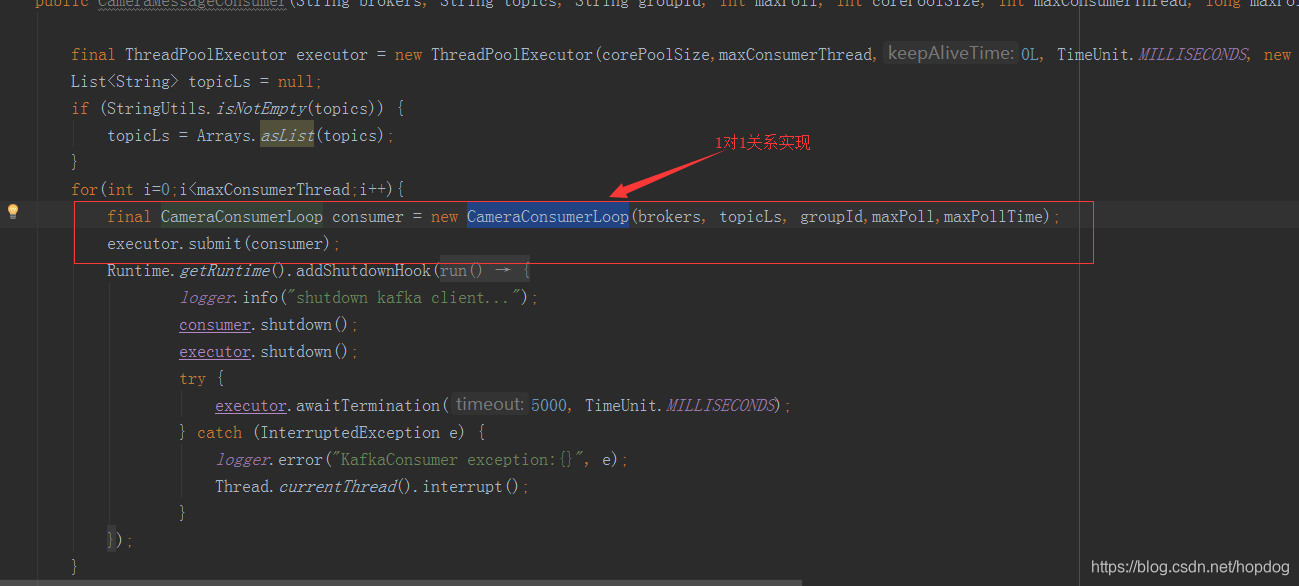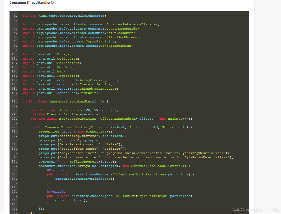 - ConsumerThreadHandler类:consumer多线程的管理类,用于创建线程池以及为每个线程分配任务。另外consumer位移的提交也在这个类中进行