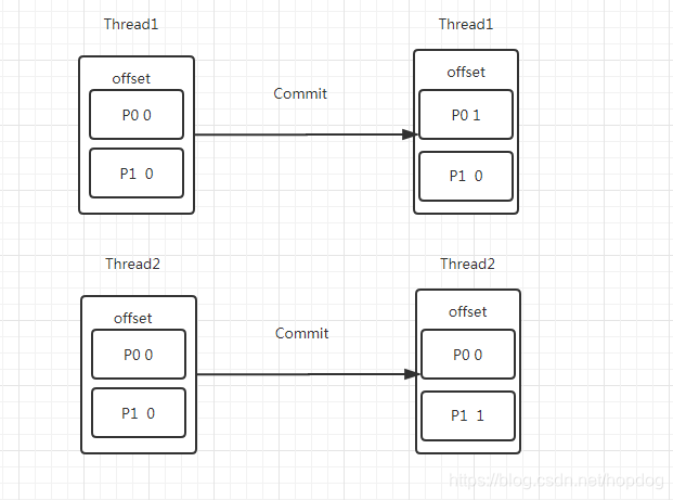 如图,当consumer1进行一次commit操作时,会同时提交分区0、1的offset信息;
