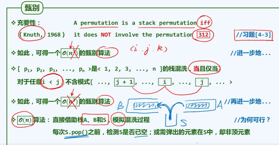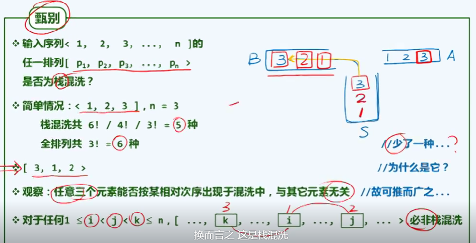 经观察,任意三个元素出现的排序方式与其他元素无关,如果出现了 k i j 的排序方式,必定不是栈混洗的结果——充要条件