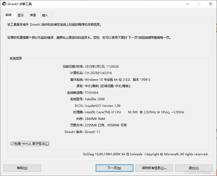打开DirectX诊断工具,它会自动扫描出系统的完整配置。