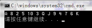 1 /******************************题目描述*********************************** 2 * 在一次晚会上,一位魔术师掏出一叠扑克牌,取出其中13张黑桃,预先洗好后, 3 * 把牌面朝下,对观众说:“我不看牌,只数一数就能知道每张牌是什么?”魔术师口 4 * 中念一,将第一张牌翻过来看正好是A;魔术师将黑桃A放到桌上,继续数手里的余 5 * 牌,第二次数1,2,将第一张牌放到这叠牌的下面,将第二张牌翻开,正好是黑桃2, 6 * 也把它放在桌子上。第三次数1,2,3,前面二张牌放到这叠牌的下面,取出第三张 7 * 牌,正好是黑桃3,这样依次将13张牌翻出,准确无误。现在的问题是,魔术师手中 8 * 牌的原始顺序是怎样的? 9 ********************************解题思路*********************************** 10 * 解决这类问题的关键在于利用倒推的方法推出原来牌的顺序。 11 * 假设桌上摆着13个空盒子,编号为1至13,将黑桃A放入第一个盒子中,从下一个 12 * 空盒子开始对空盒子计数,当数到第二个空盒子时,将黑桃2放入空盒子中,然后再 13 * 从下一个空盒子开始对空盒子计数。顺序放入3,4,5等,直到全部放入13张牌,注意 14 * 在计数时要跳过非空的盒子,只对空盒子计数,最后得到的牌在盒子中的顺序,就是 15 * 魔术师手中原来牌的顺序。 16 * 17 ********************************注释*********************************** 18 * 2012-1-14 by 樊列龙 19 ****************************************************************************/ 20 21 public class 魔术师的秘密{ 22 public static void main(String []args){ 23 int []poker = new int[14]; 24 String []pokerStr = {"0","A","2","3","4","5","6","7","8","9","10","J","Q","K"}; 25 int mem = 1; 26 int j = 1; 27 for(int i = 1; i < 14; i++){ 28 int n = 0; 29 for(j = mem; n != i; j++){ 30 if (j > 13) j = 1; 31 if(poker[j] == 0){ 32 n++; 33 } 34 } 35 mem = j--;//这里的自减必不可少,并且只能是后置的自减 36 poker[j] = i; 37 } 38 39 // for(int i = 1; i < 14; i++){ 40 // System.out.print(poker[i] + " "); 41 // } 42 // System.out.println(); 43 44 for(int i = 1; i < 14; i++){ 45 System.out.print(pokerStr[poker[i]] + " "); 46 } 47 System.out.println(); 48 } 49 }