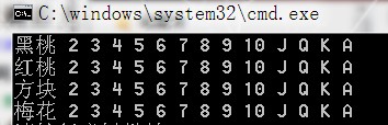 1 /******************************题目描述*********************************** 2 * 用数组构建一副扑克牌52张(花色和数值),并输出到屏幕。 3 * 提示:可以用二维数组来实现 4 ********************************解题思路*********************************** 5 * 6 * 用一个poker[4][14]来存储信息,每行的第一个位置存放花色,其他的放数字 7 * 8 ********************************注释*************************************** 9 * 2012-1-15 by CocoonFan 10 ****************************************************************************/ 11 12 13 public class 数组构建扑克牌{ 14 public static void main(String [] args){ 15 /*for(int i = 1; i <= 255; i++){ 16 System.out.print( (char)i +"->" + i + " "); 17 }*/ 18 19 String []pokerStr = {"2","3","4","5","6","7","8","9","10","J","Q","K","A"}; 20 String []pokerType = {"黑桃","红桃","方块","梅花"}; 21 String poker[][] = new String[4][14]; 22 for(int i = 0; i < 4; i++){ 23 poker[i][0] = pokerType[i]; 24 for(int j = 0; j< 14; j++){ 25 if(j == 0){ 26 System.out.print(poker[i][j] + " "); 27 continue; 28 } 29 poker[i][j] = pokerStr[j-1]; 30 System.out.print(poker[i][j] + " "); 31 } 32 System.out.println(); 33 } 34 } 35 }