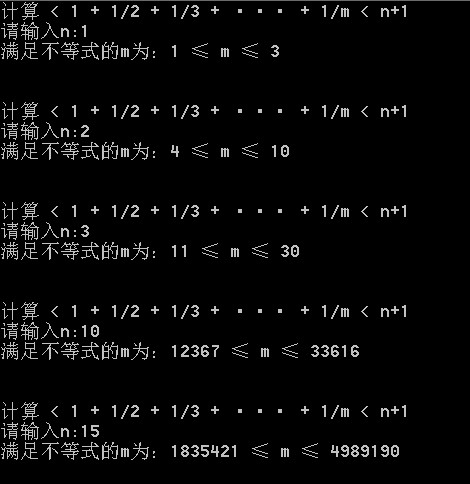 13 printf("计算 < 1 + 1/2 + 1/3 + ··· + 1/m < n+1\n");