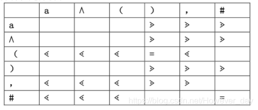 - 从文法中找出形为aQb(终结符+非终结符+终结符)和ab(终结符+终结符)的部分,然后在相应的表格填=。